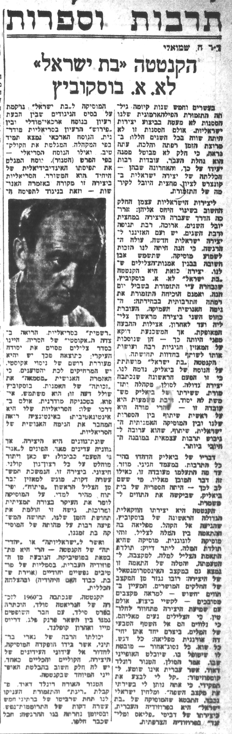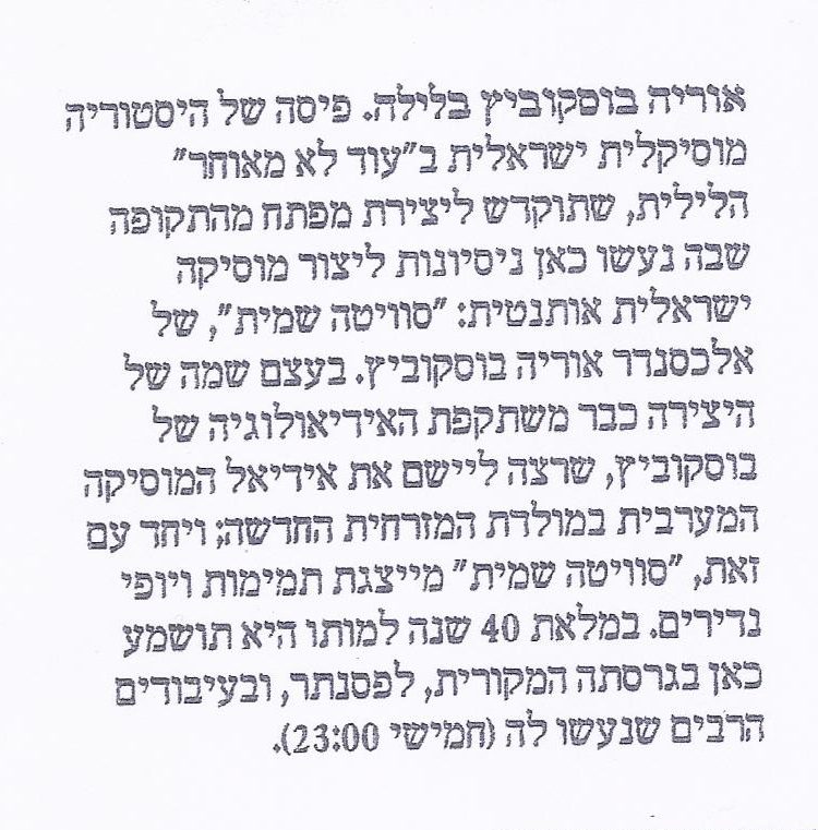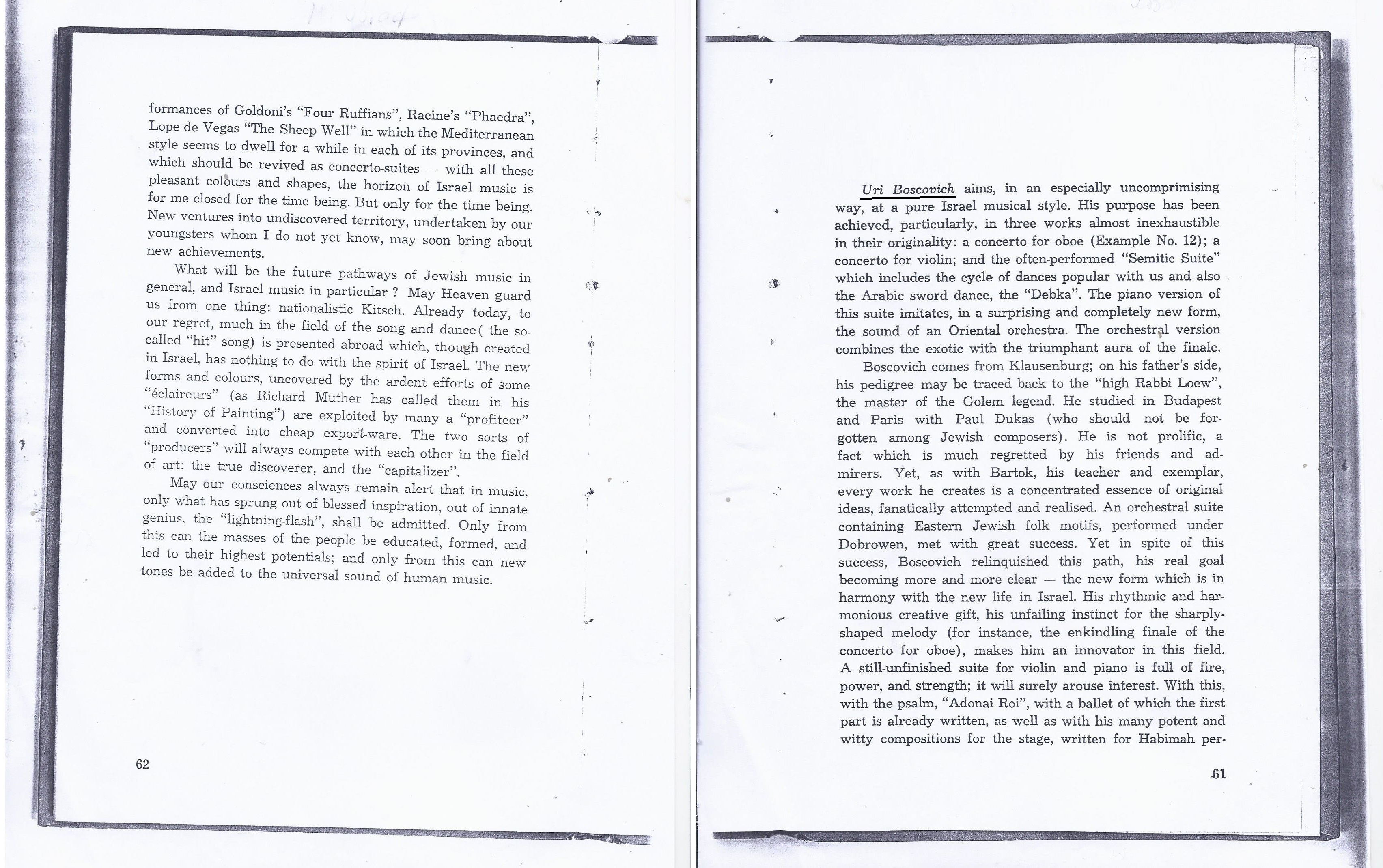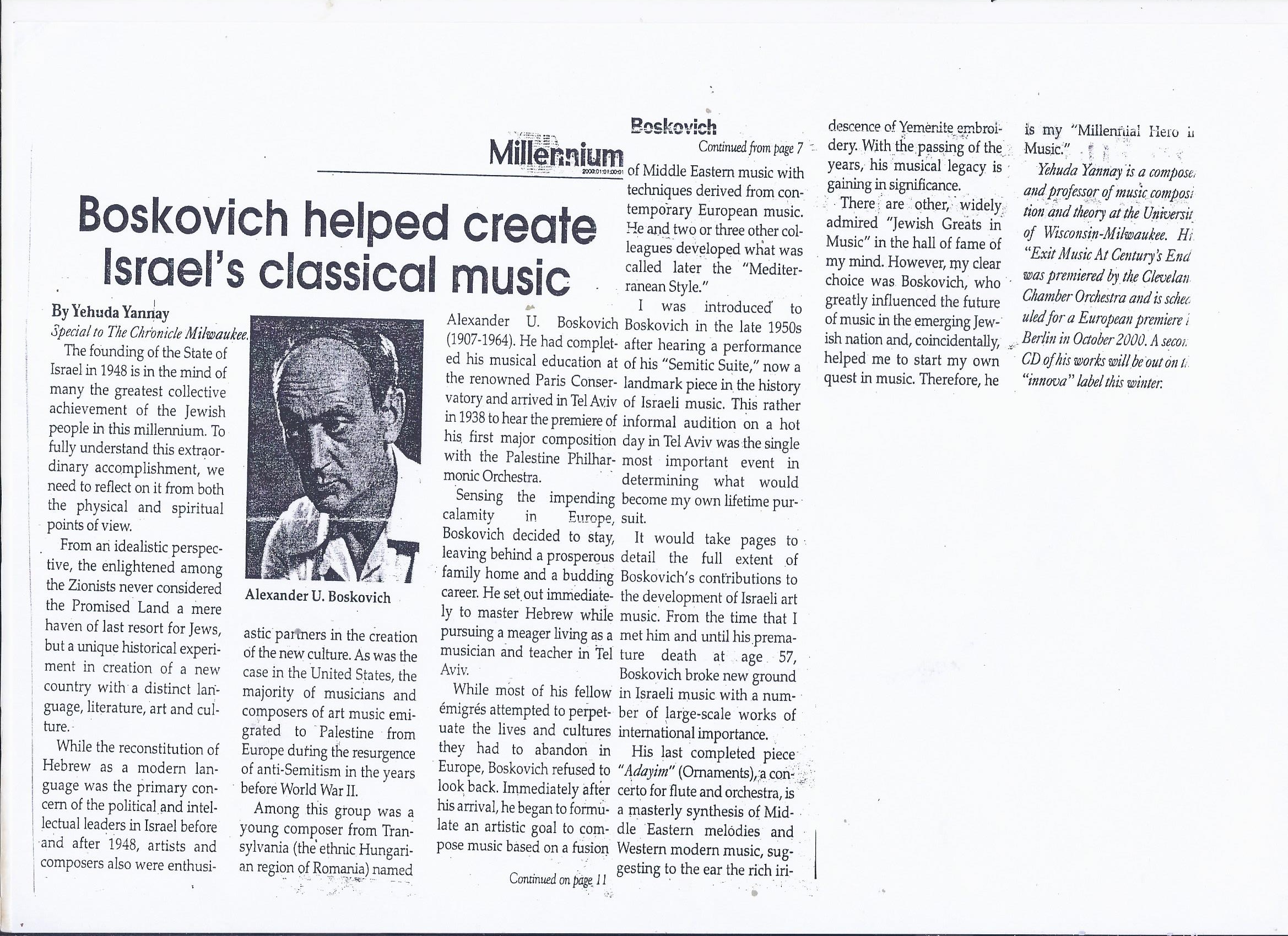 IMI News 1997/2-1998/1 – issue dedicated to Boskovich. Articles by Jehoash Hirshberg (“Alexander Uriyah Boskovich and the Quest for an Israeli National Style”), Nathan Mishori (“Shemot – The Last Unfinished Work of A. U. Boskovich”), Herzl Shmueli (“The ‘Where’ and the ‘When’ in the Dialectic Thought of Alexander Uriyah Boskovich”), Yehuda Yannay (“Encountering the Boskovich Legacy – A Generation Later”), Habib Hasan Touma (“Alexander Uriyah Boskovich, My Teacher”) and Igal Myrtenbaum (“IMI PRESENTS: Concerto da Camera [by Alexander Uriyah Boskovich] – Composition in the Shade of Its Genealogy”; also available, in Hebrew and in English, in the liner notes to MII-CD-26; see Discography). (EN)