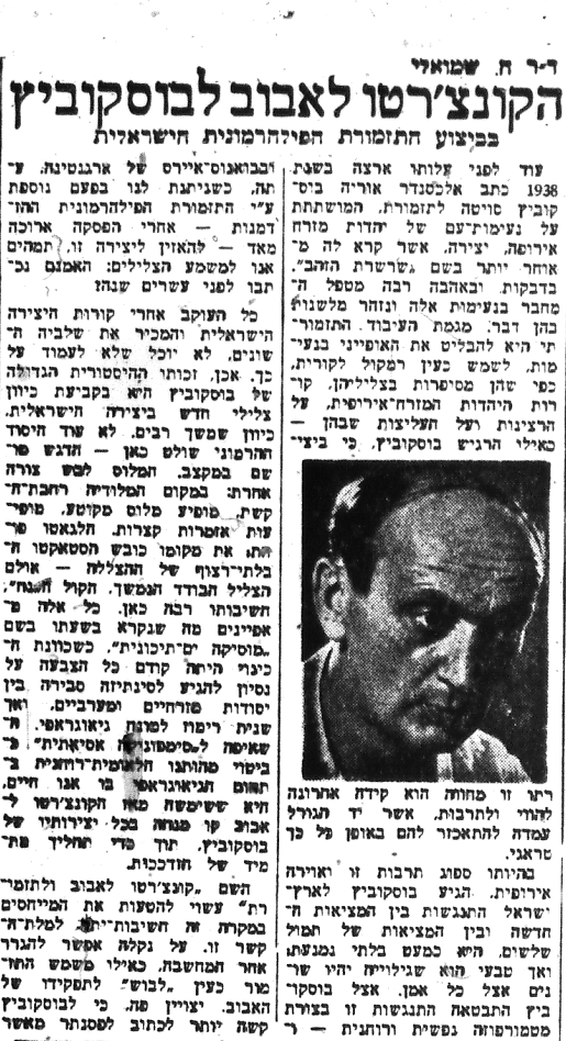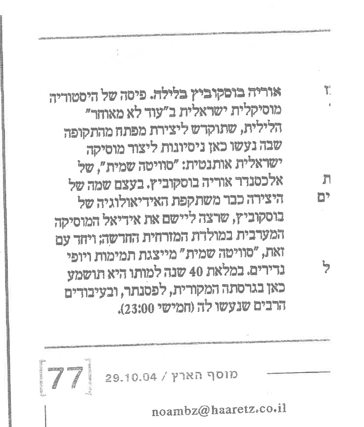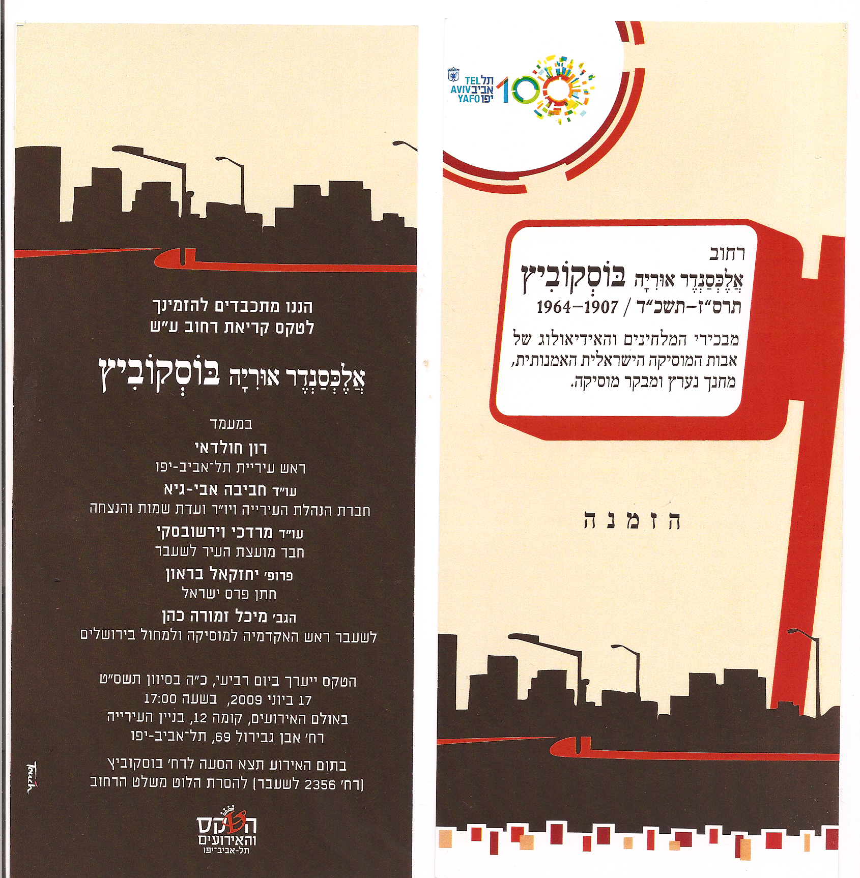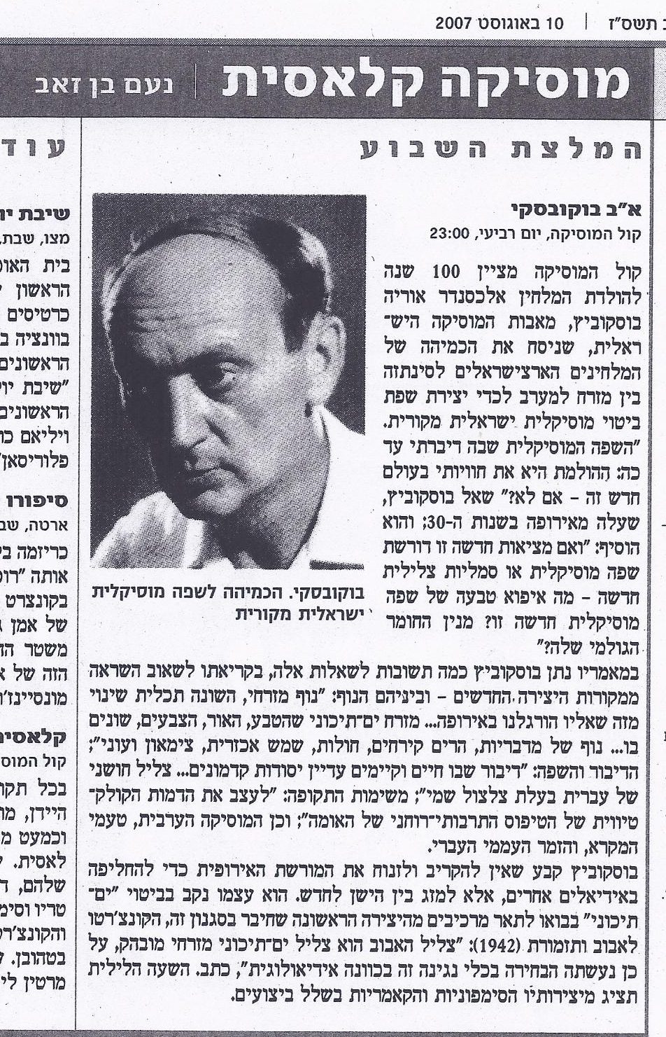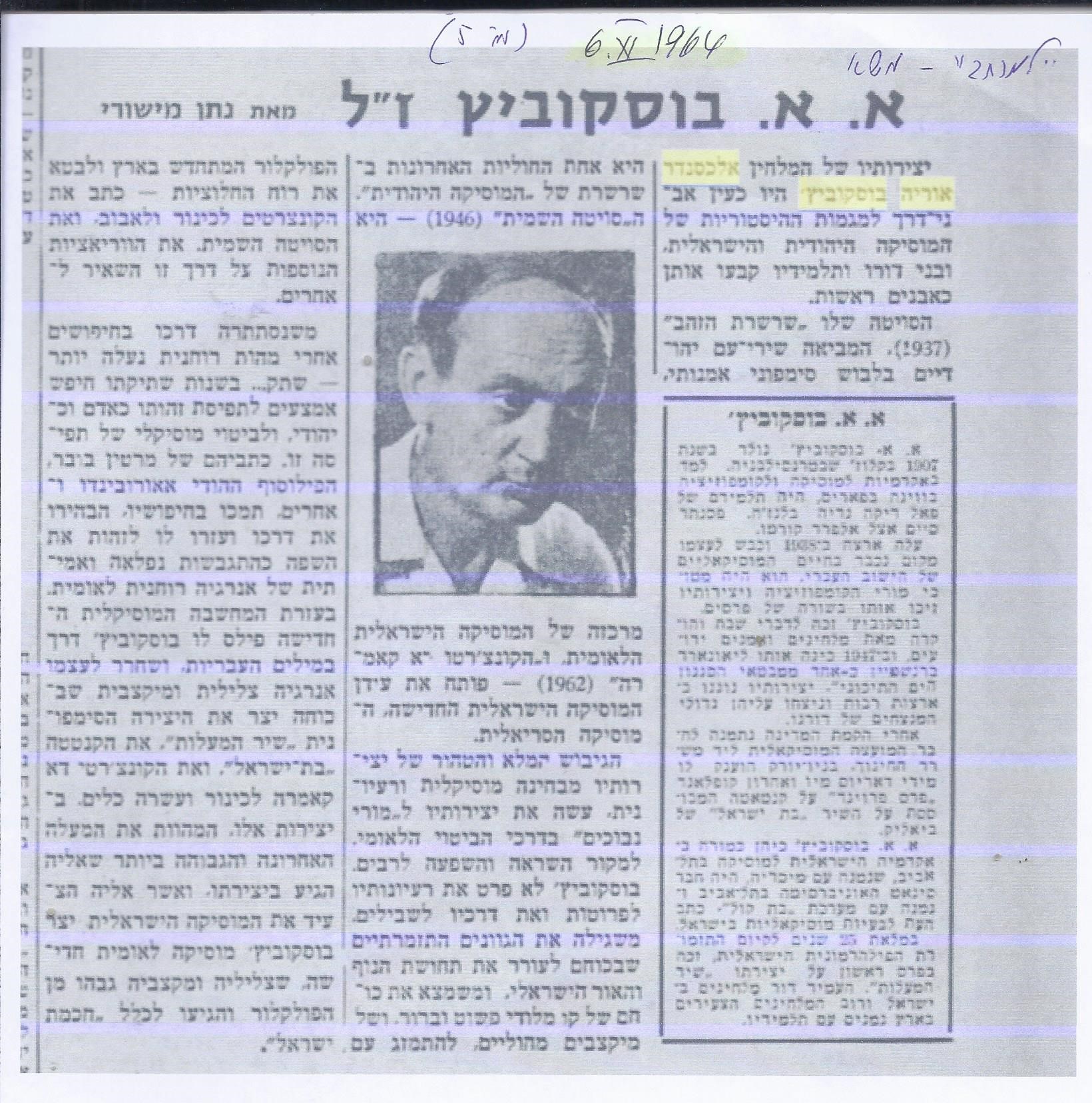 Hirshberg, Jehoash. “The Music of Alexander Uriyah Boskovich (1907- 1964) as Representation of Ideology in Israeli Music”. Studia Judaica XIV (Cluj-Napoca: Babes-Bolyai University, The History and Philosophy Faculty; the Moshe Carmilly Institute for Hebrew and Jewish History, 2006), pp. 395-405. (EN)