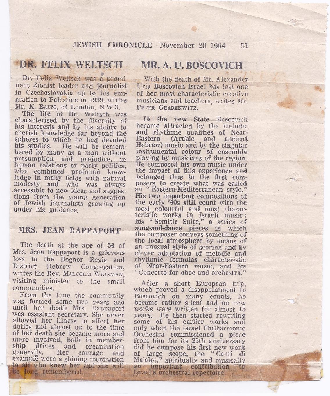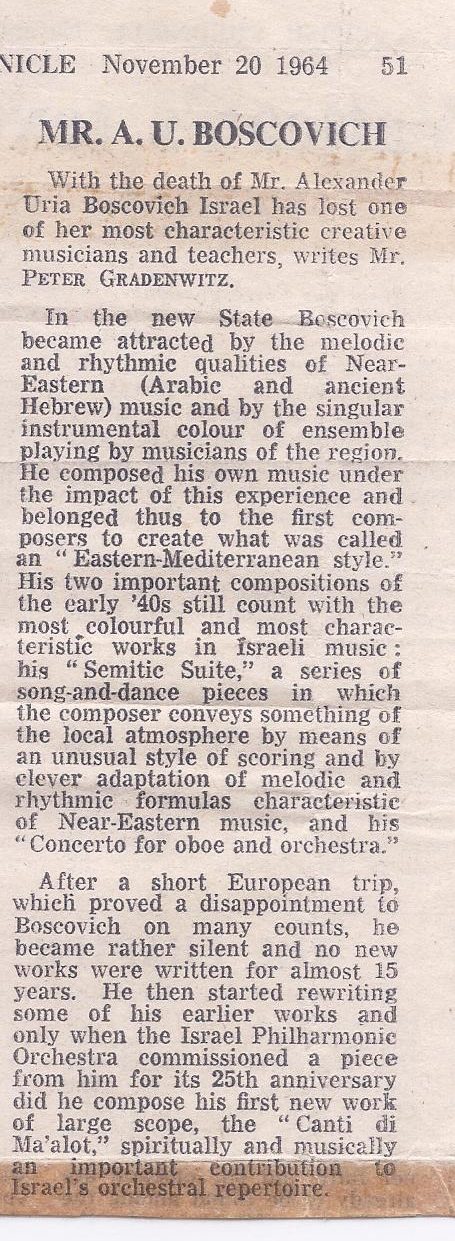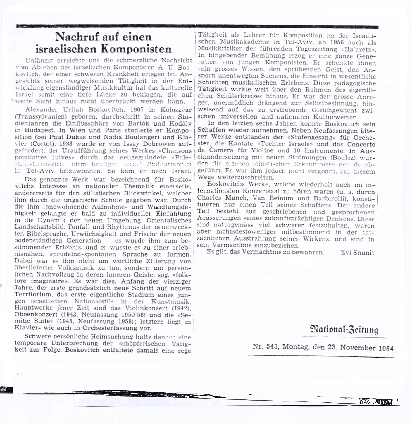 Sellman-Eggebert, Ulrich. “Israels großter Komponist – zum Tode Alexander Uriyah Boskovich”. Darmstädter-Echo, 4.12.1964. (DE)
