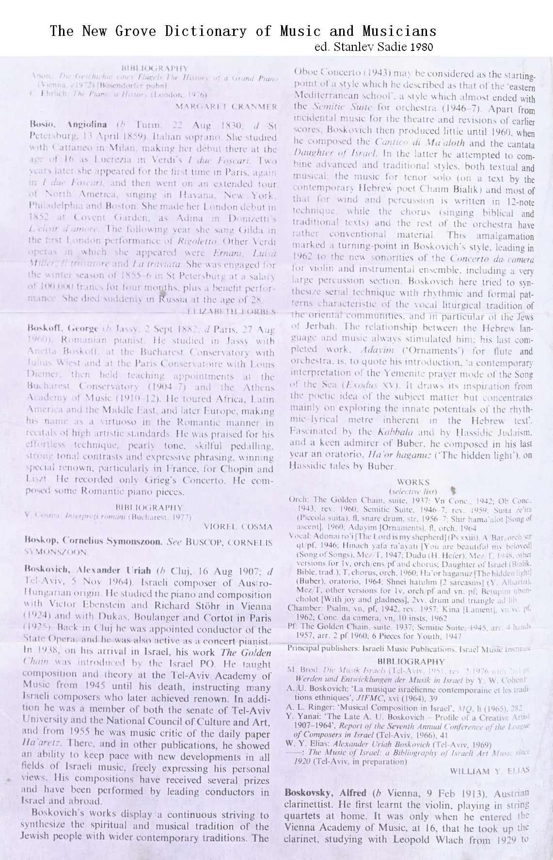 This list does not include the many reports, articles and eulogies on Boskovich and his music published in periodicals and daily newspapers in Israel and abroad (including several by the musicologists Herzl Shmueli and Jehoash Hirshberg, authors of the Boskovich monograph cited below, as well as prominent figures in Israeli musical life, including the author, composer and musician Max Brod; the critic and musicologist Natan Mishori; composers Tzvi Avni and Yehuda Yannay; and others). We have also omitted entries on Boskovich that appeared, inter alia, in The New Grove Dictionary of Music and Musicians (1980, revised 2001; also available online), Encyclopedia Judaica (1971, revised 2007; also available online), Alice Tischler’s Descriptive Bibliography of Art Music by Israeli Composers (1989, revised 2001), and others.