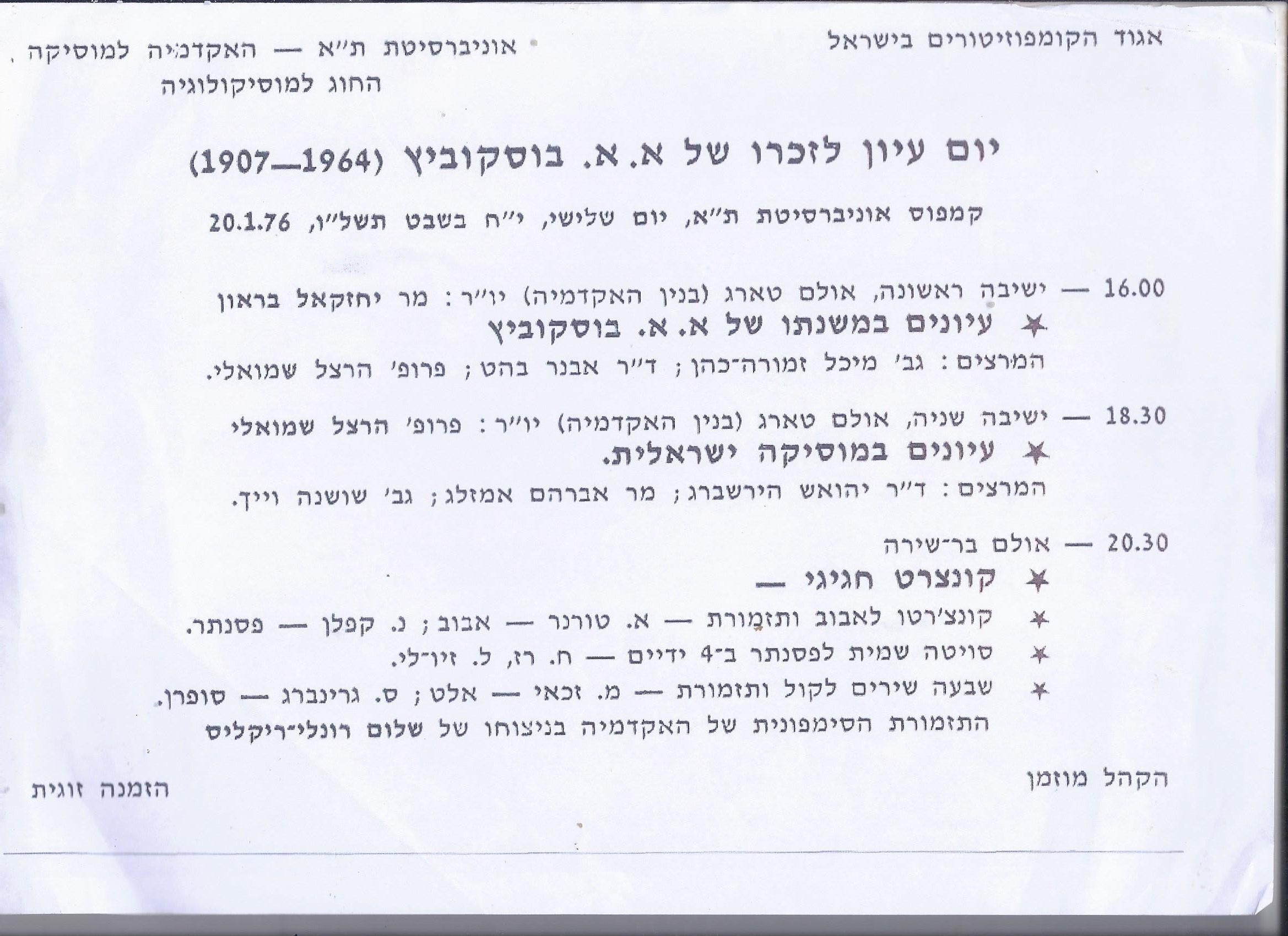 Iyunim Be-Muzika (Journal of the Israel Composers’ League), issues 11-12 (October 1976): Proceedings of the study day “Alexander Uriyah Boskovich – his Music and his Thought”. Introduction by Yehezkel Braun; papers by Michal Smoira-Cohn (“A. U. Boskovich’s Legacy as Artist and Critic”), Herzl Shmueli (“A. U. Boskovich’s Theory and Philosophy”) and Avner Bahat (“Boskovich – his Last Works”). (HE)