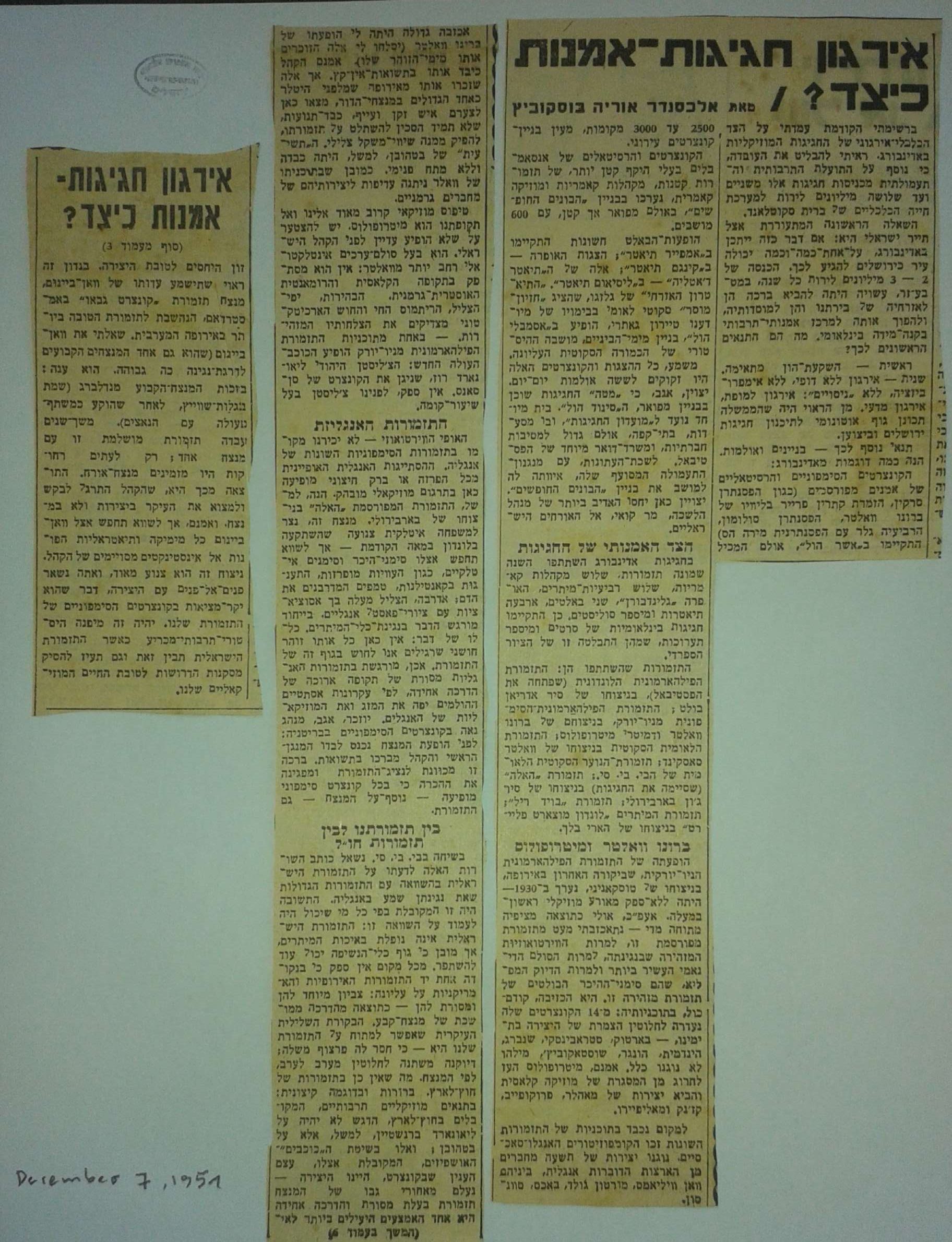 “The Problems of Music – and Original Music in Israel, Part 1: Problems of Music”, Orlogin 3 (July 1951), pp.177-187; “The Problems of Original Music in Israel”, Orlogin 9 (November 1953), pp.280-294. Selections from this two-part essay are included in Hirshberg & Shmueli, Alexander Uriyah Boskovich, pp. 193-210. (HE)