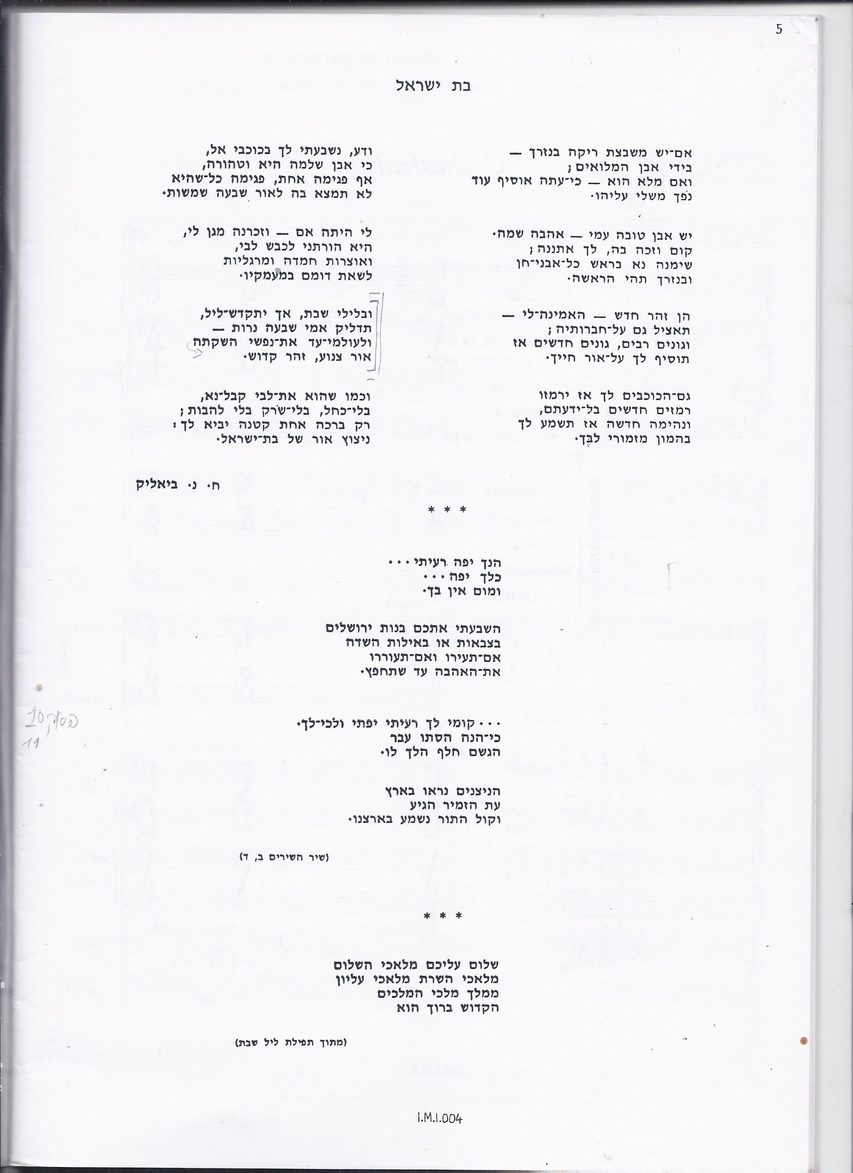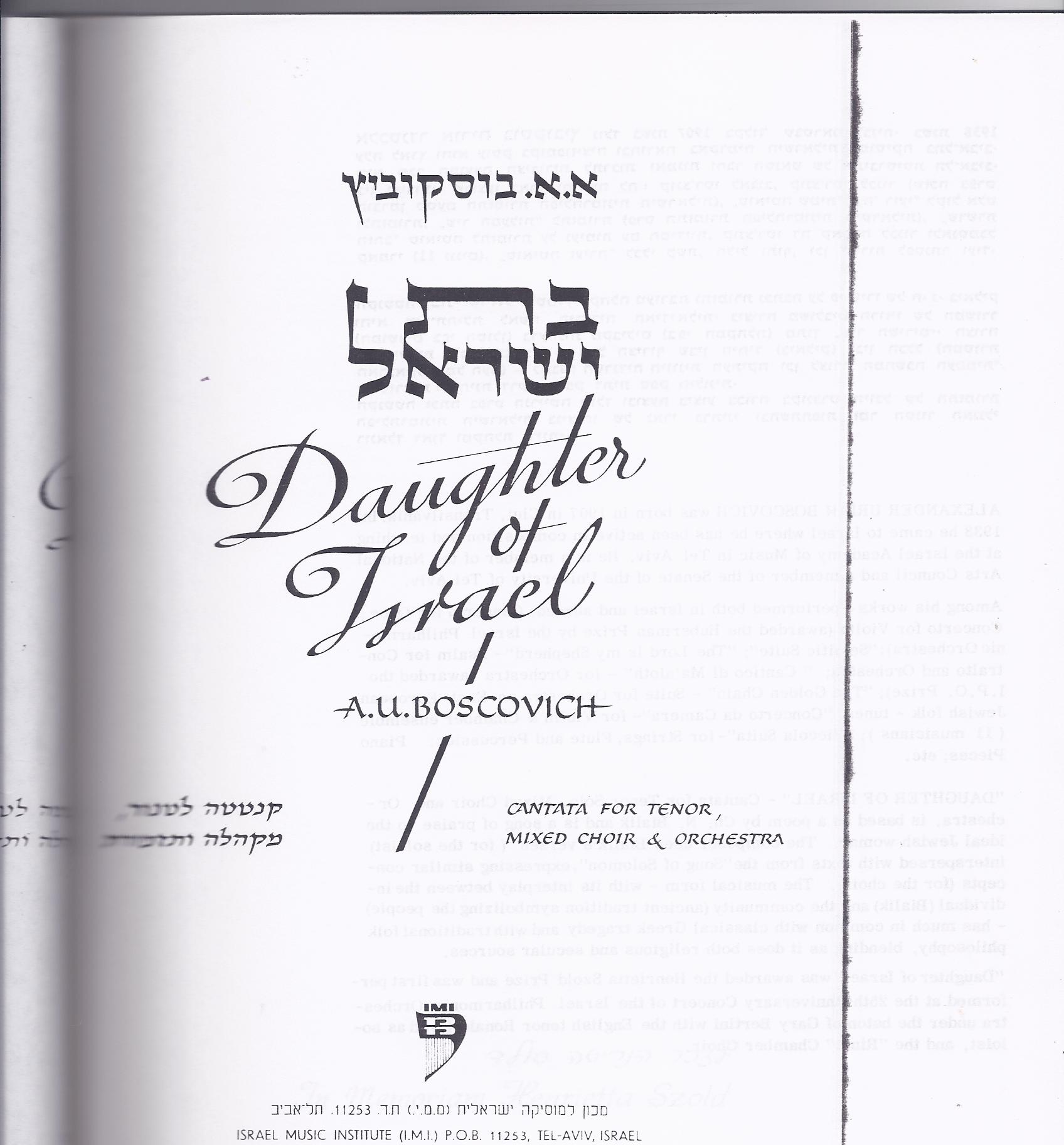 Cantata for T, Choir & SO Text : Haim Nachman Bialik Song of Songs, Shabbat Prayers. (See Links).