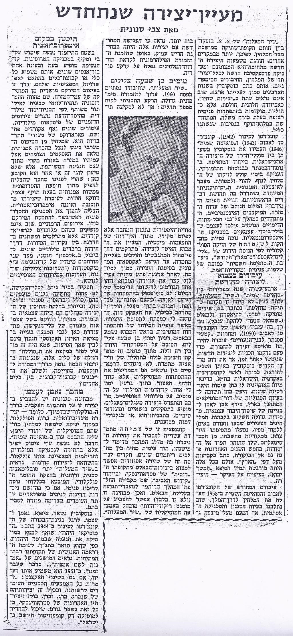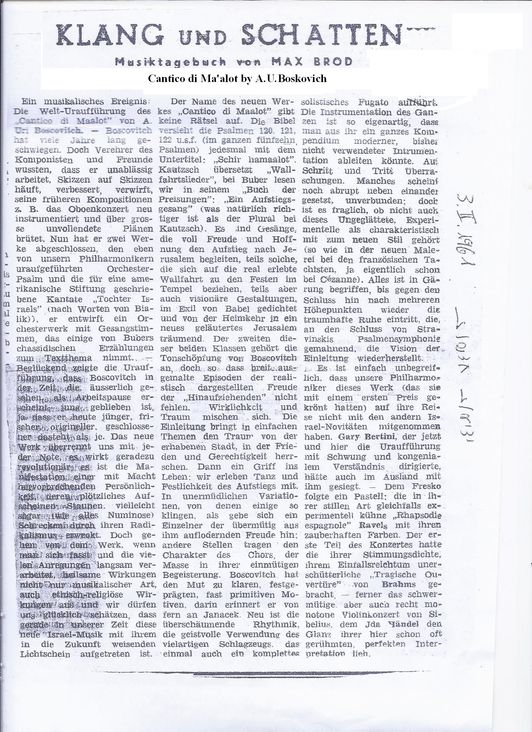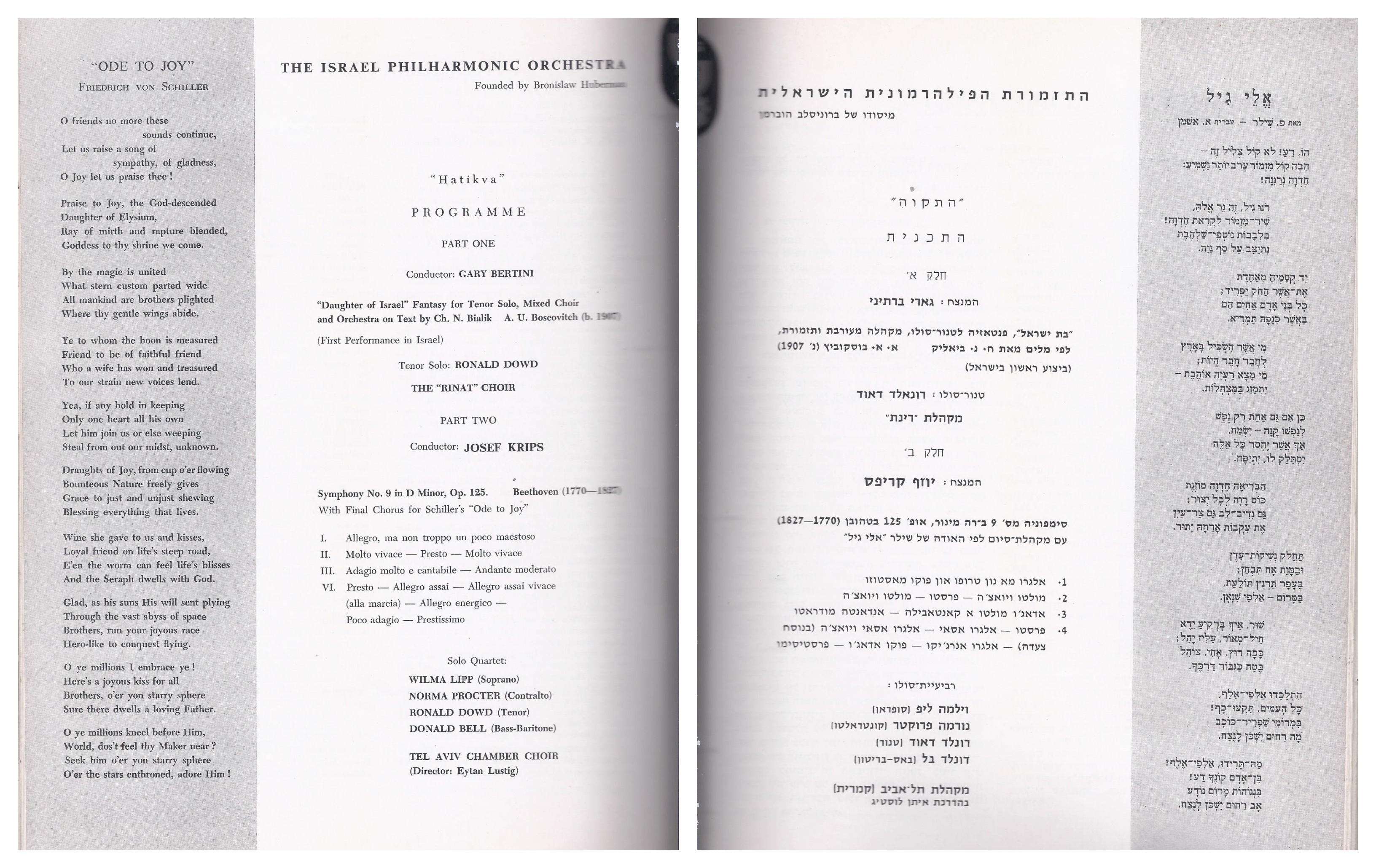 1961 – WP: Ronald Dowd – T, Rinat Choir, IPO, Gary Bertini – cond. Tel Aviv, 26/30/31.12.1961, 2/3.1.1962; Haifa. 27.12.1961; Ein Gev, 28.12.1961; Jerusalem, 1.1.1962. Part of a concert celebrating the IPO’s 25th anniversary. See also under Discography.